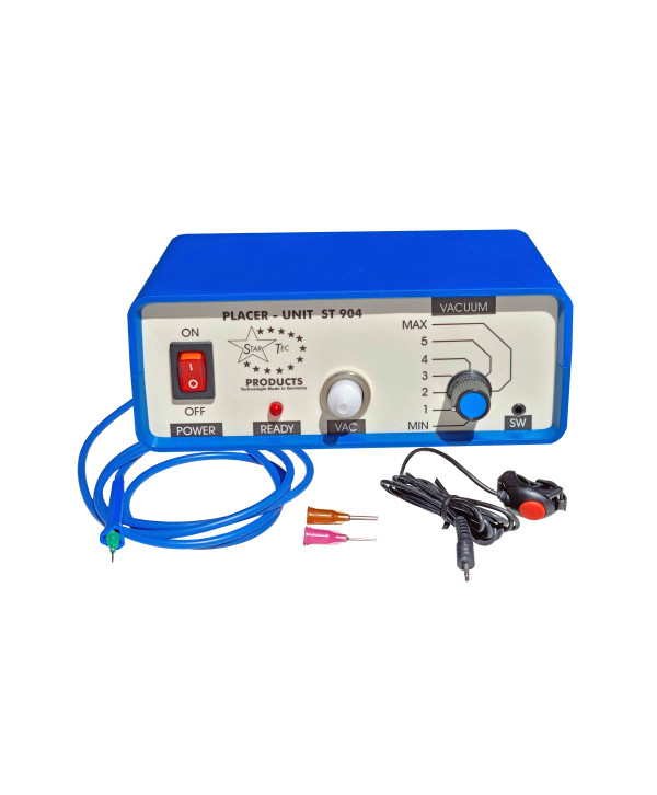 The equipment includes: The ST-904 station, the transporter by suction with the pump, suction tips ST-90451= 0,61mm diameter pink, ST-90452 = 0,84 mm diameter green and ST-90453 1,37 mm diameter brown), push button ST-90250.